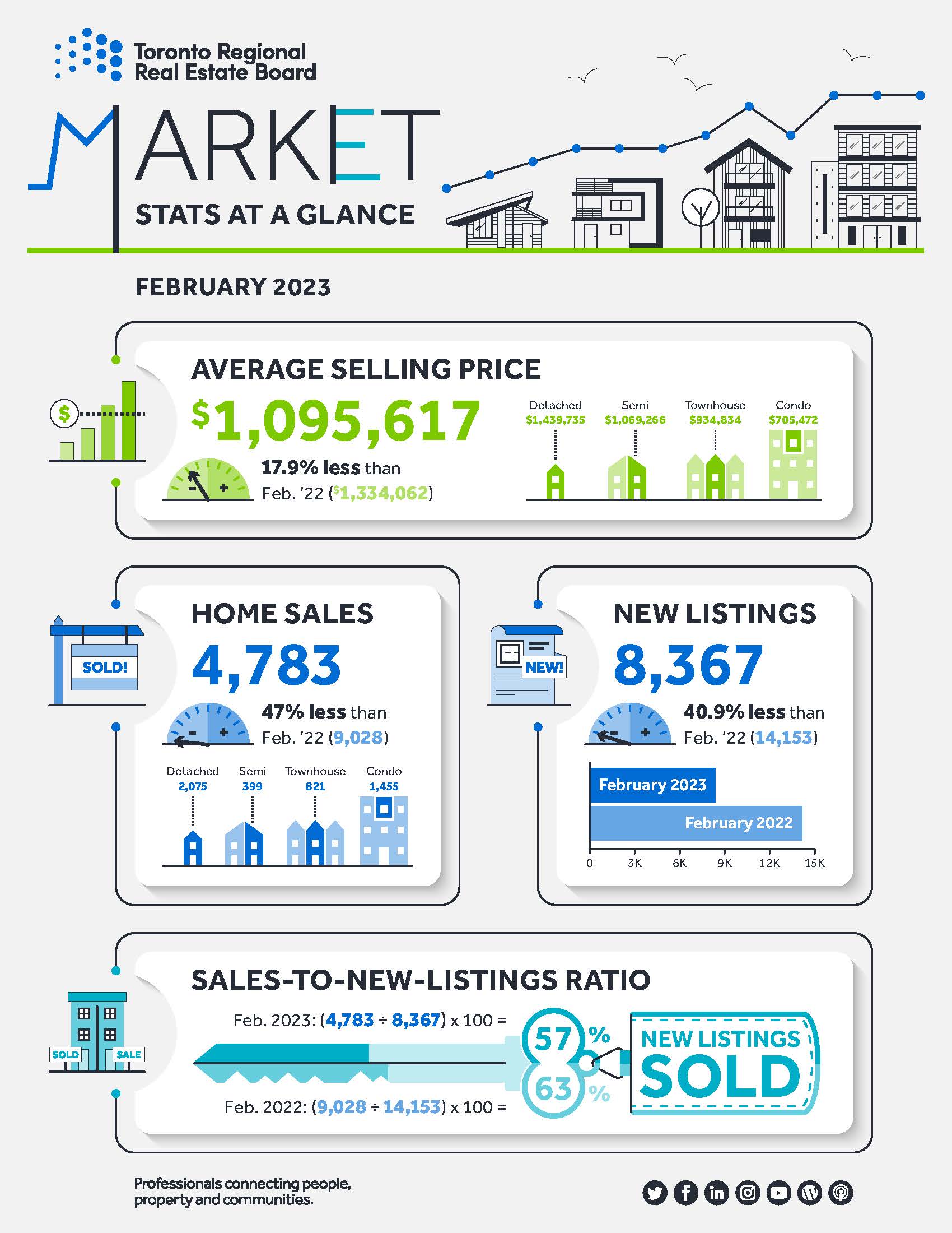 GTA REALTORS® reported 4,783 sales through TRREB’s MLS® System in February 2023 – down 47 per cent compared to February 2022, the last full month before the onset of interest rate hikes. The number of new listings entered into the system was down by a similar annual rate of 40.9 per cent to 8,367.
