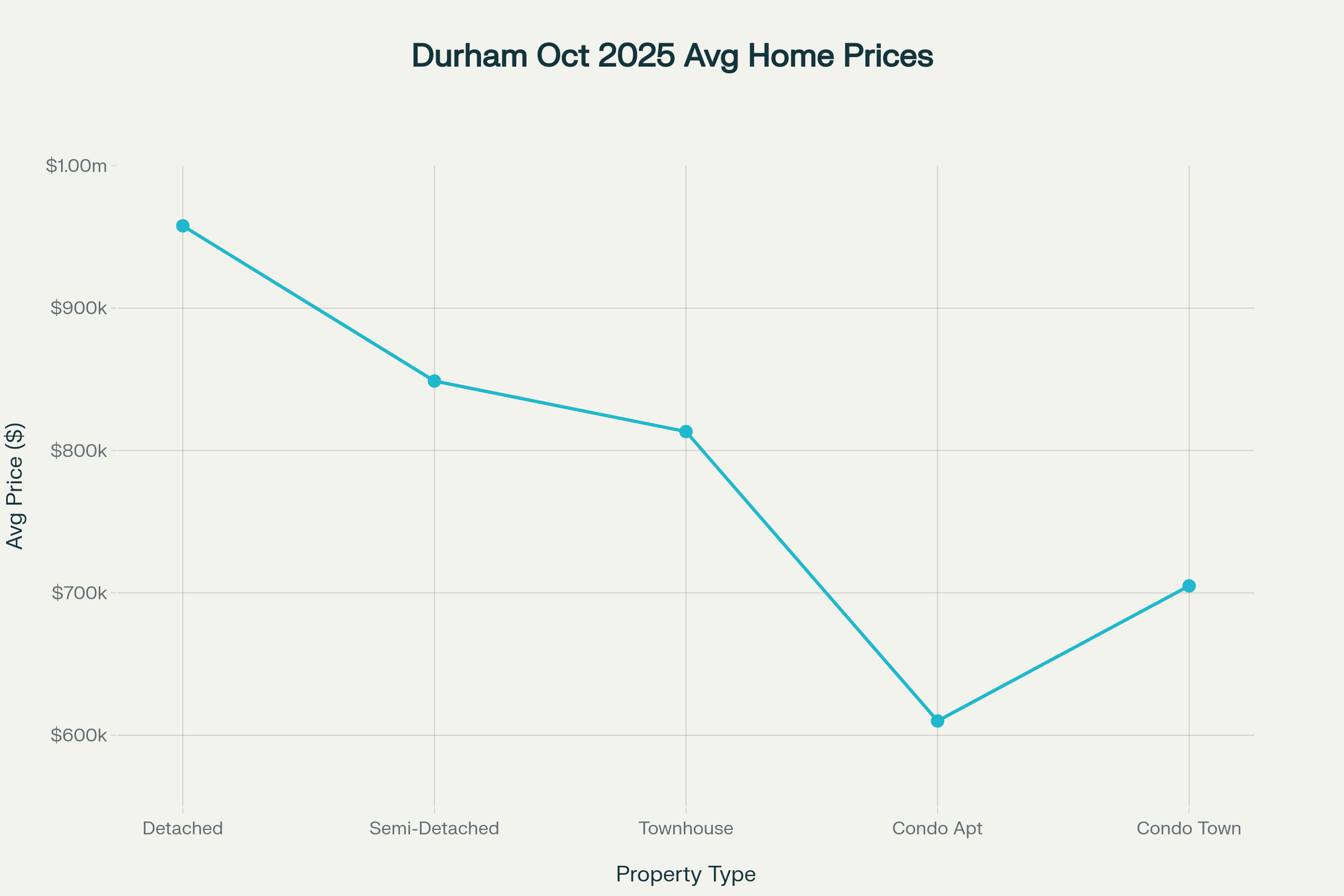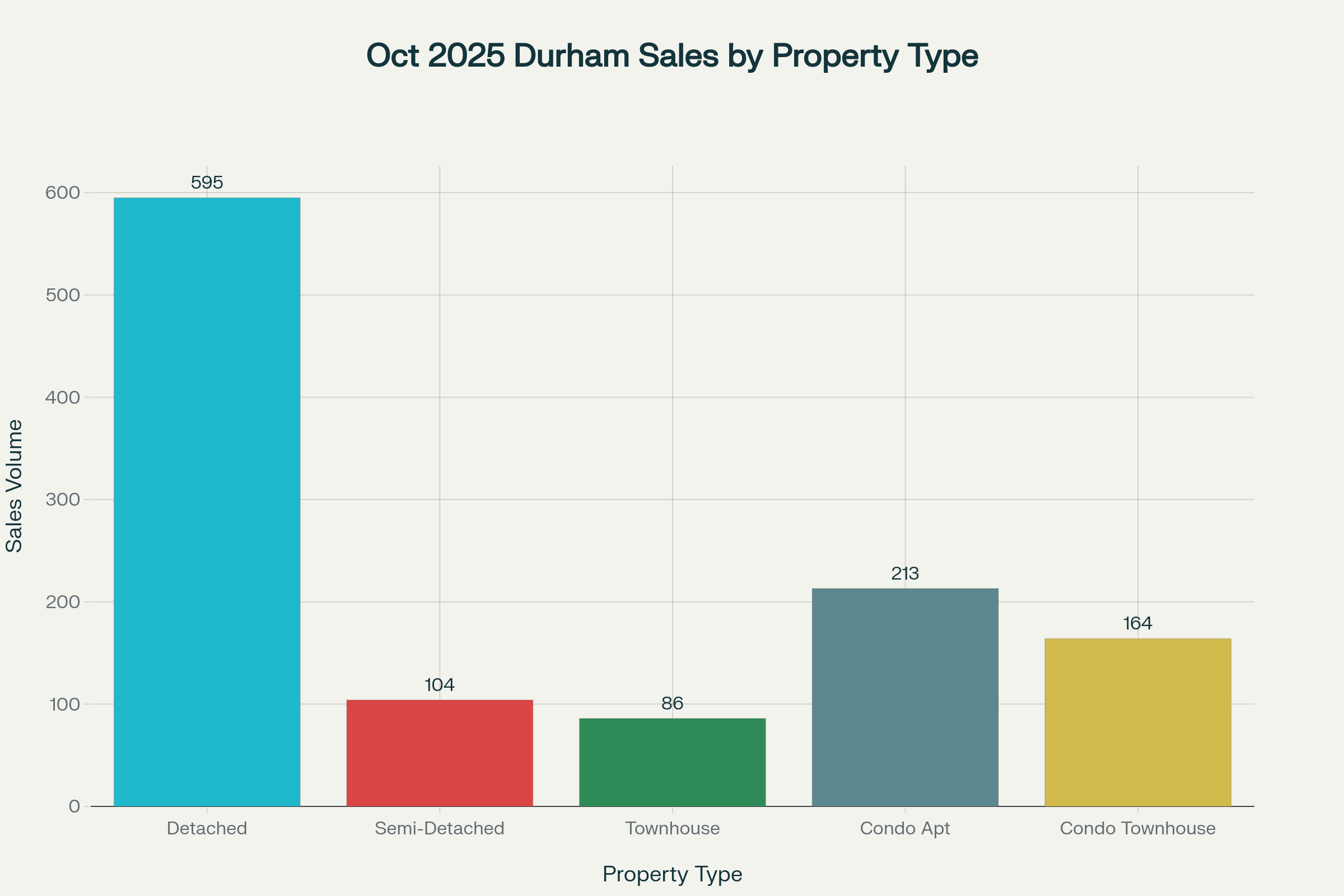Condo Apartments: Durham’s average price for a condo apartment in October 2025 was $610,000, down almost 7% year-over-year. The volume for condo apartment sales was 213, demonstrating stable but selective buyer intent in this segment.