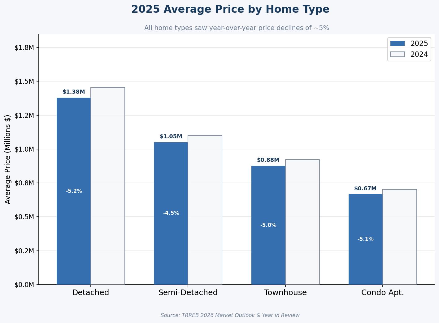 Across the entire GTA, the average selling price for all home types in 2025 was approximately $1,067,968, a decrease of 4.7% from 2024. Detached homes saw the steepest correction at 5.2%, while the condo segment fell by 5.1% due to high inventory levels.