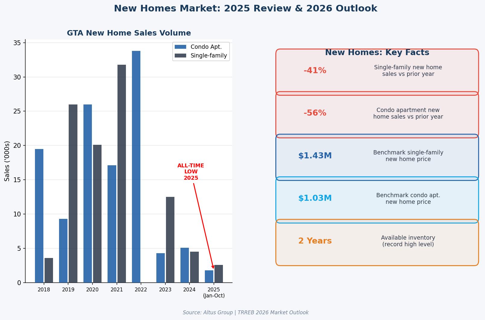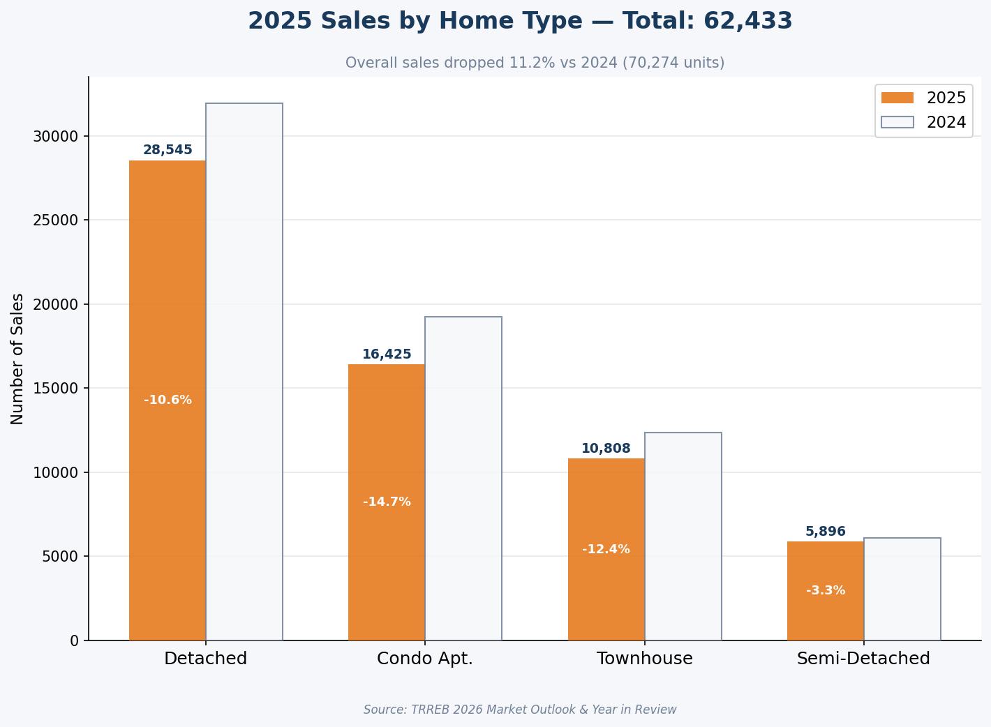 The condominium apartment segment faced the most significant challenges in 2025. Sales volume for condos dropped by $14.7\%$ year-over-year, while the average selling price fell by 5.1% to $667,235. The sector was impacted by a “perfect storm” of factors: