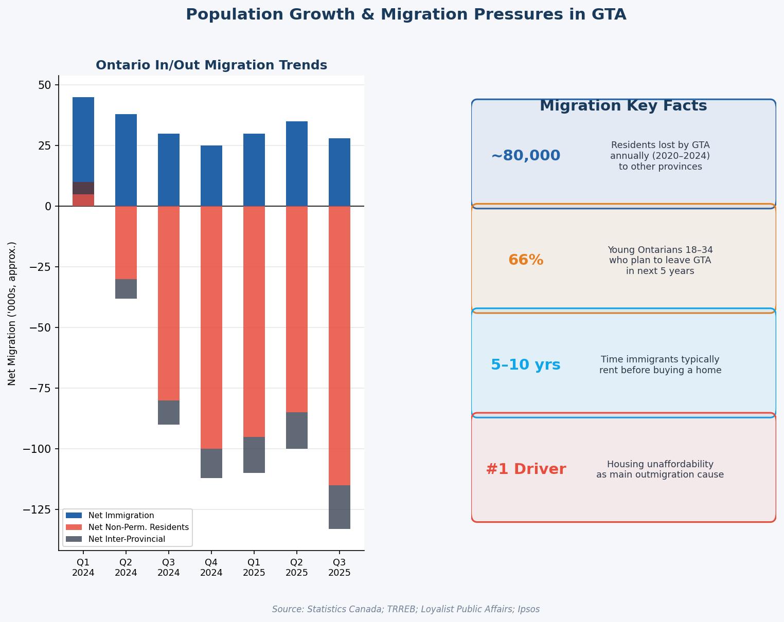 Outmigration is primarily driven by housing unaffordability, high property taxes, and extreme traffic congestion. Many young professionals and families are using remote work flexibility to relocate to more affordable regions like Alberta or Southwestern Ontario, where the cost of living and property taxes are significantly lower.