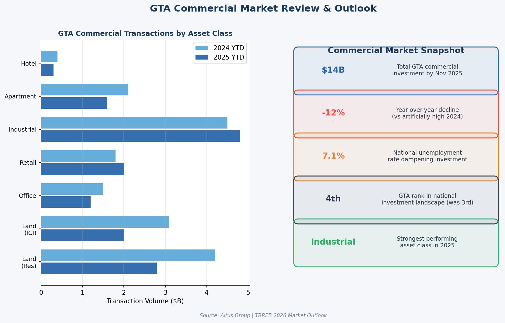 Office investment remained the laggard, down 28% year-over-year. While improved leasing activity offered some hope, the sector continued to struggle with valuation uncertainty. Multi-residential investment also saw a sharp 62% decline from the previous year, although demand for value-add assets remained strong as financing conditions improved. The commercial sector in 2025 was defined by a “disciplined approach,” where investors were extremely selective, focusing on necessity-based assets like grocery-anchored strip malls, which saw a 49% resurgence in deal volume.