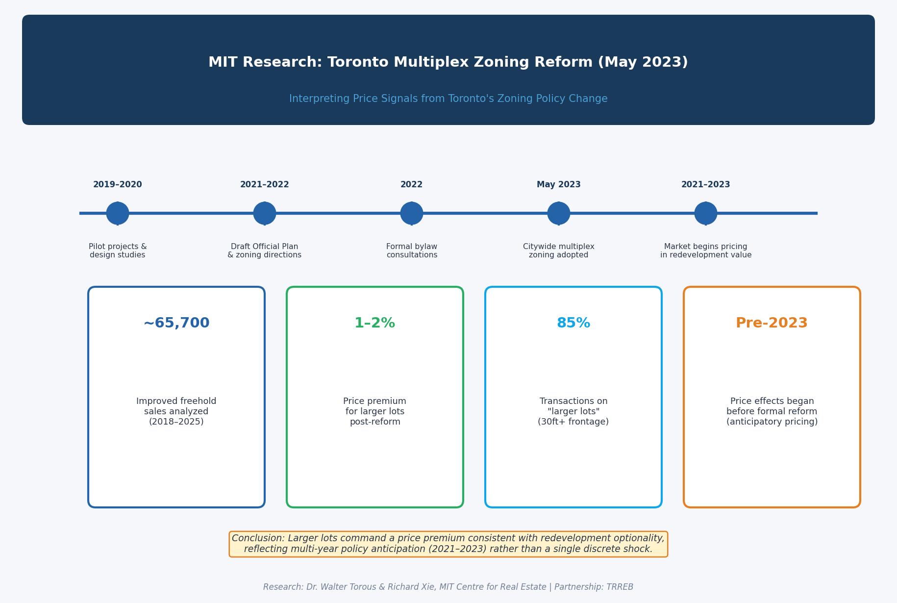 MIT research found that Toronto’s 2023 multiplex zoning reform led to a modest 1%-2% relative price increase for “larger lots” (30ft+ frontage). However, much of this value was “priced in” by the market during the policy discussion phase between 2021 and 2022.