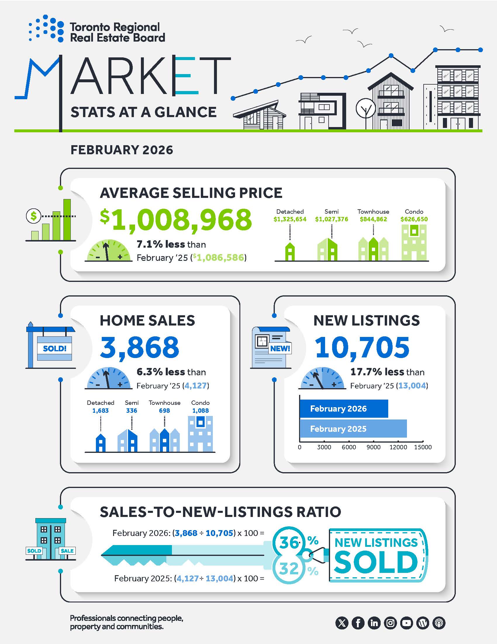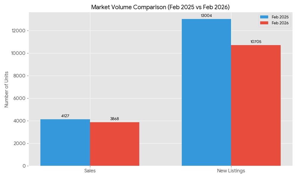 The Greater Toronto Area (GTA) resale housing market in February 2026 was characterized by tightening conditions, as a significant drop in new listings outpaced the decline in home sales. While overall sales volume decreased by 6.3% year-over-year, new listings saw a much sharper decline of 17.7%.