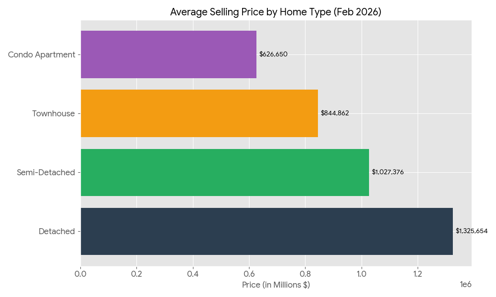 A quick-reference guide for your readers to see exactly where average prices landed in February 2026. It showcases the price hierarchy from Detached homes at $1,325,654 down to Condo Apartments at $626,650. This is an essential “anchor” visual for any market update.