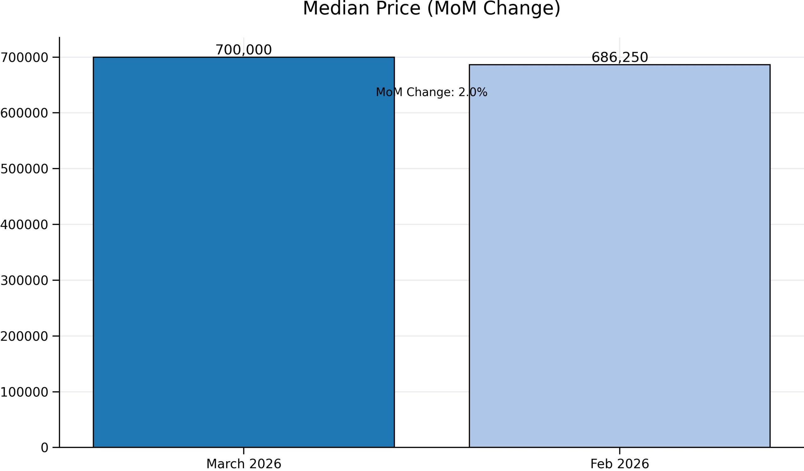 Median Sale Price: This is often a more accurate “middle-of-the-road” indicator. The median price rose 2.0% month-over-month to $700,000.