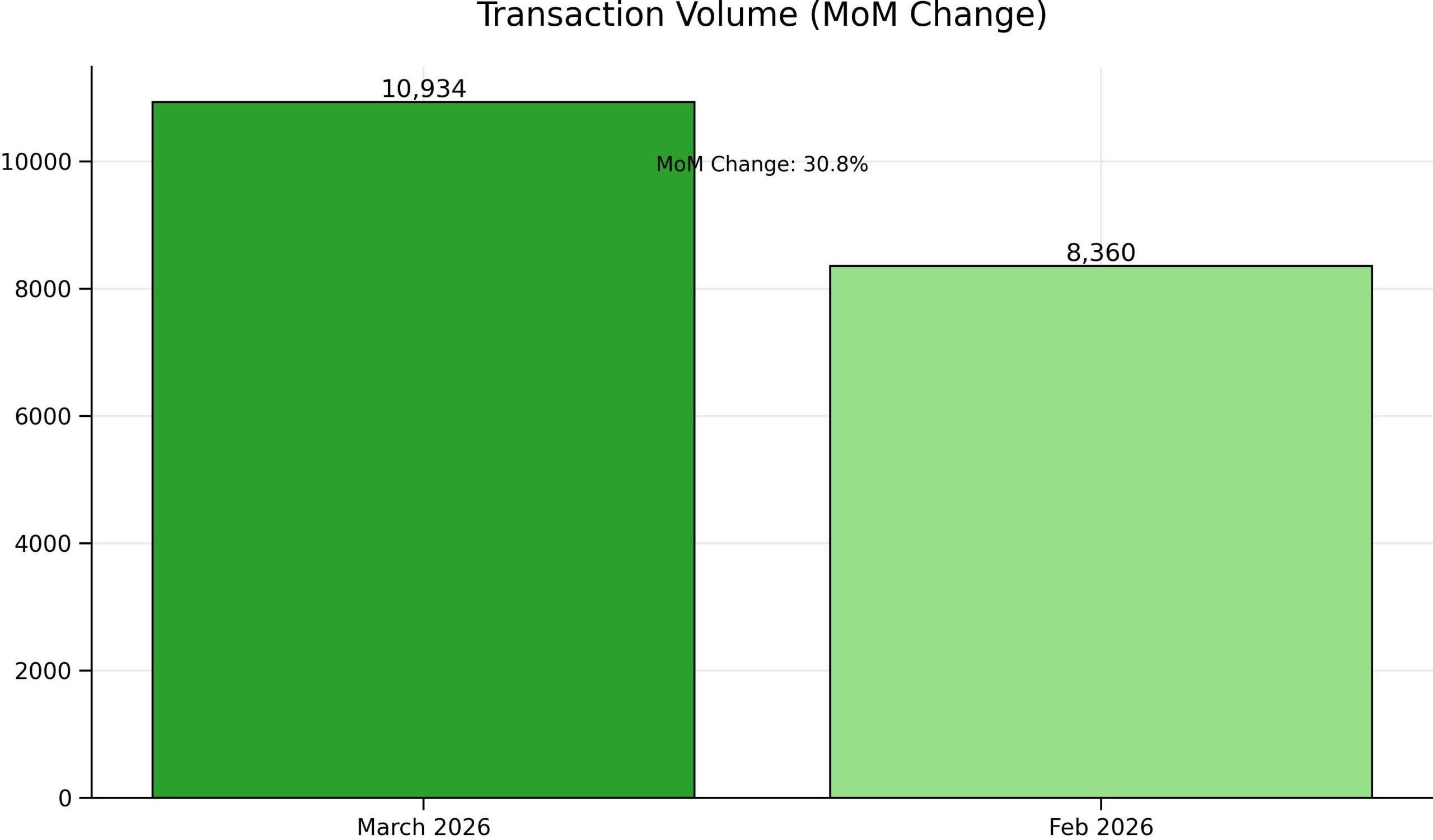 | Transaction Volume | 10,934 | +30.8% | Buyers are active and absorbing inventory. |