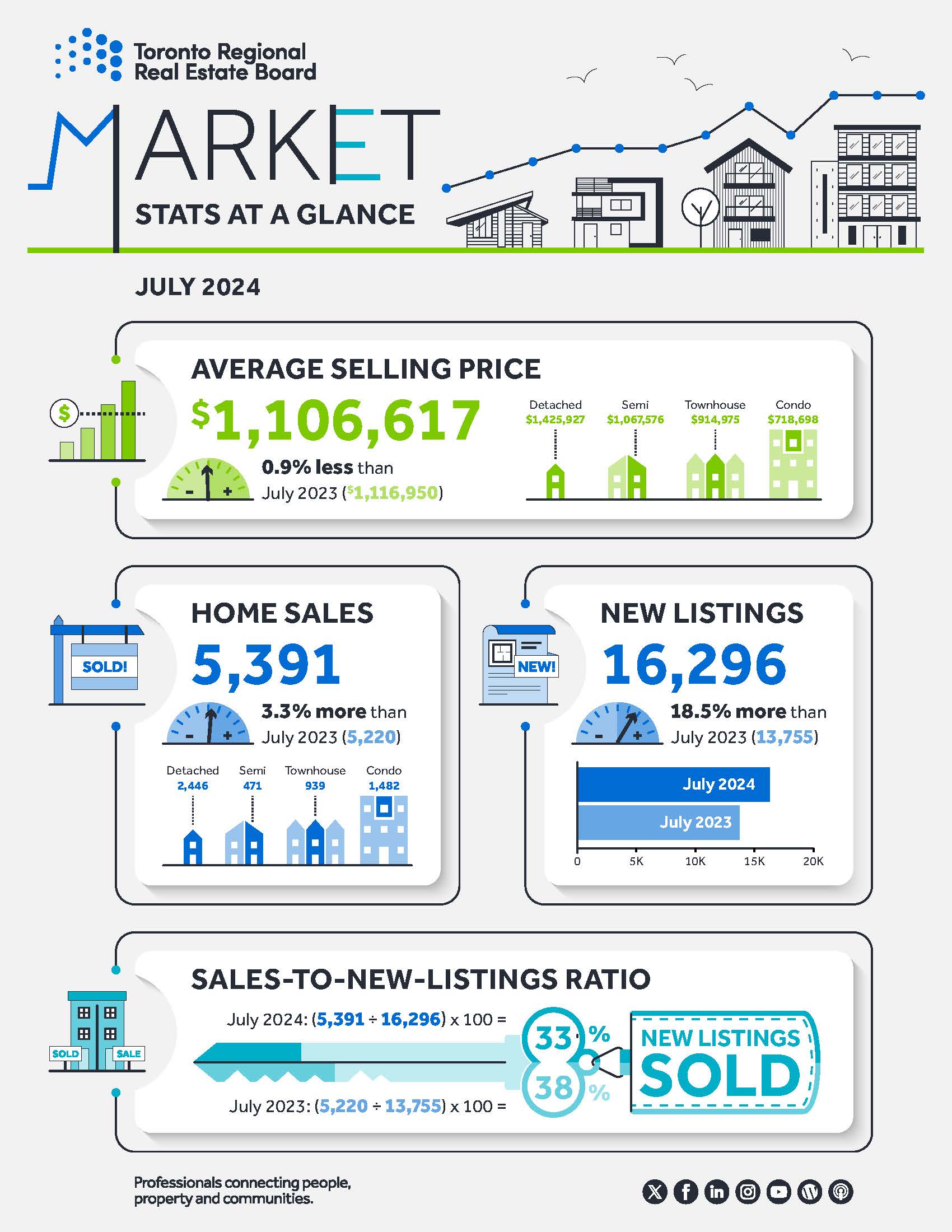 TORONTO, ONTARIO, August 6, 2024 – The Greater Toronto Area (GTA) housing market saw an increase in sales compared to July 2023. While this is positive news, buyers continue to have more options due to a significant rise in new listings. As a result, average selling prices have eased slightly.