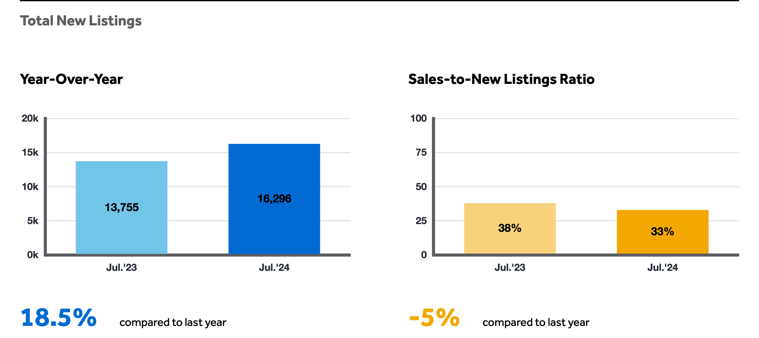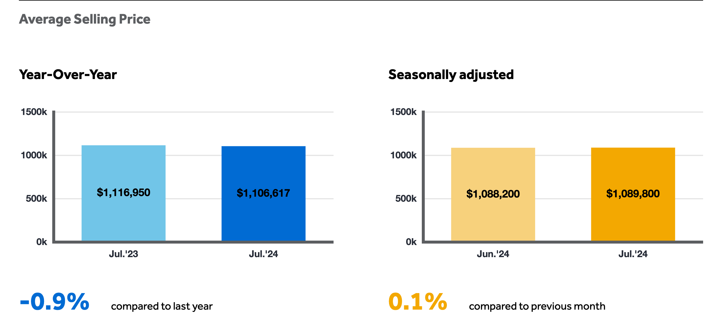 Average selling prices dropped 0.9% year-over-year to $1,106,617, and the MLS® Home Price Index Composite fell by approximately 5%. However, both measures saw slight increases compared to June on a seasonally adjusted basis.